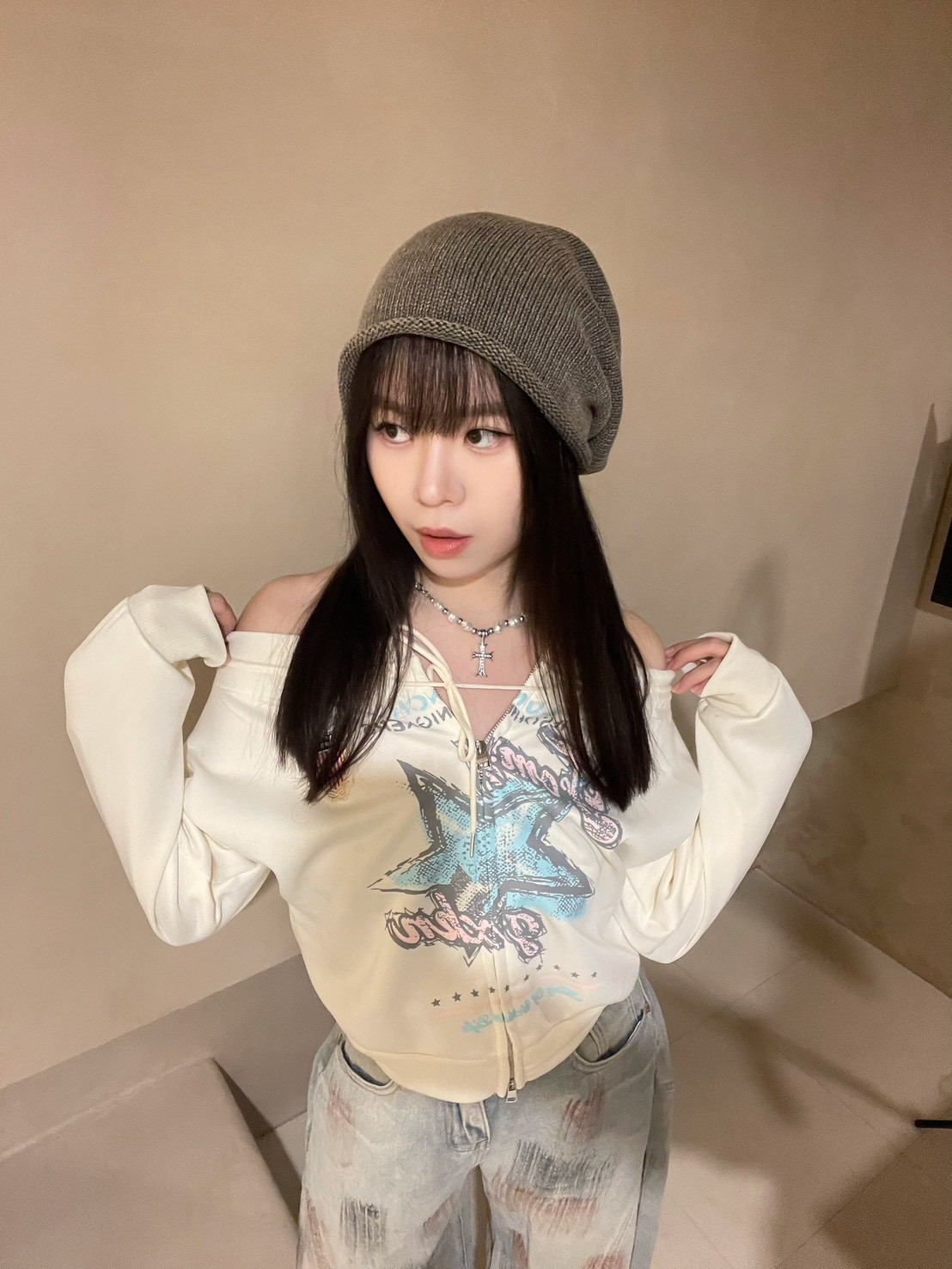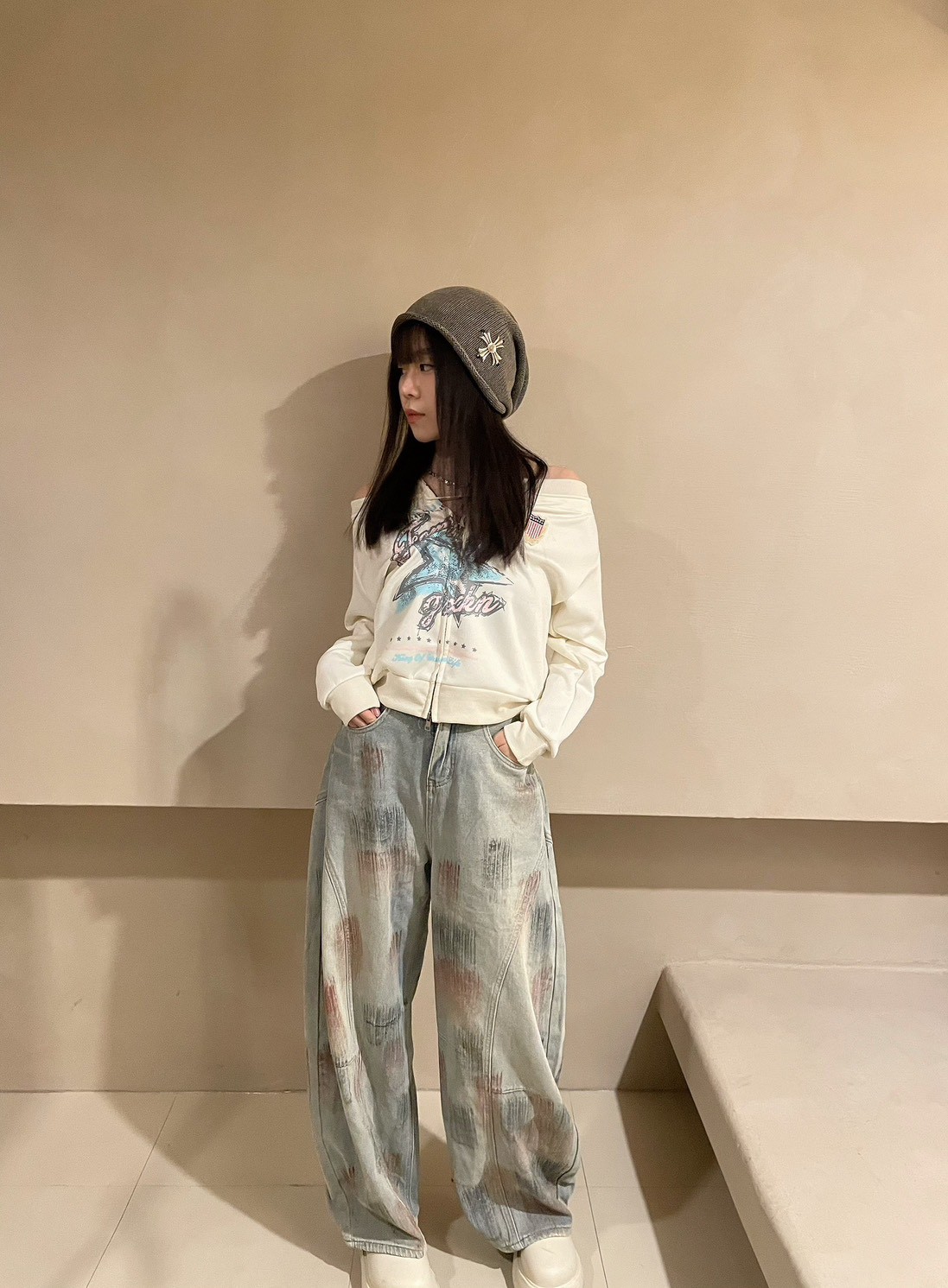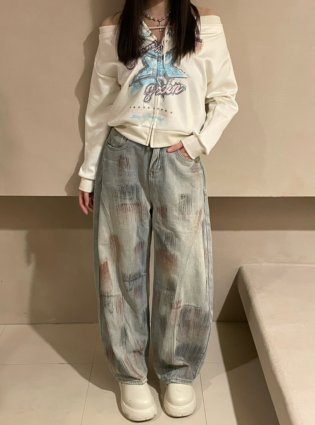 復古手繪星星一字領衛衣
